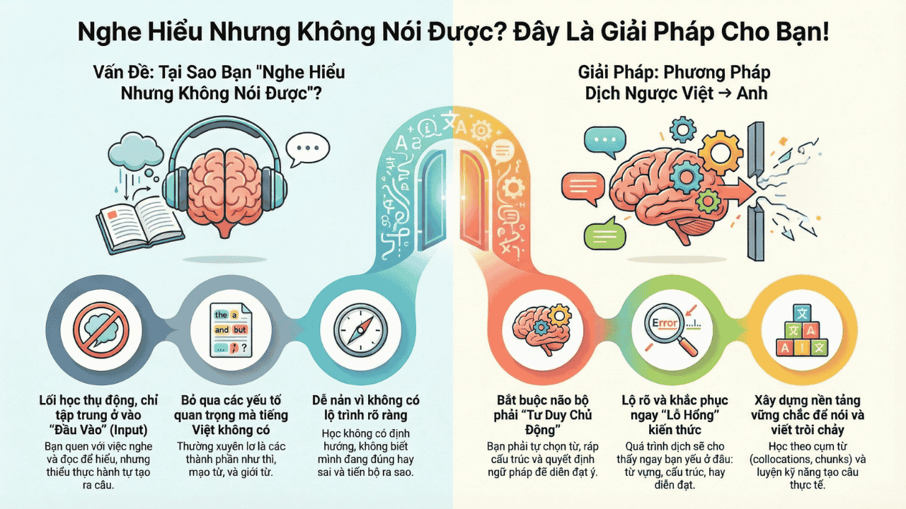 Nghe câu tiếng Việt → tự dịch sang tiếng Anh để kích hoạt phản xạ nói/viết (output – đầu ra), không còn học kiểu “hiểu mà không nói được”.